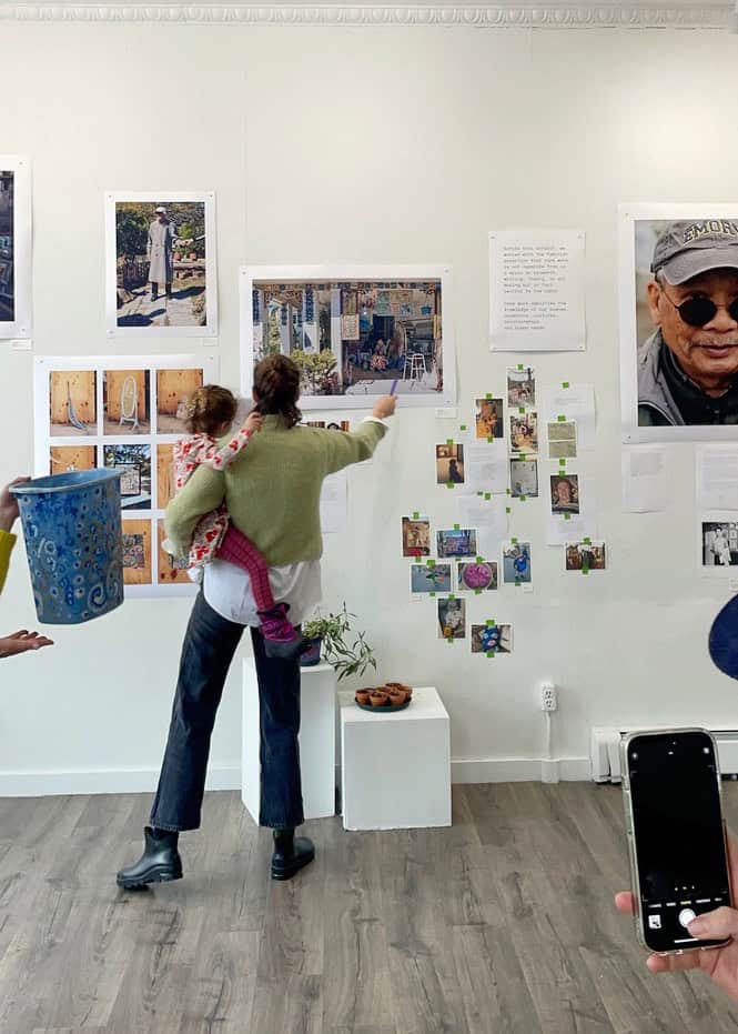 CAMERON + MEI: "To share the art of caregivers, we couldn't take a one-size-fits-all approach. Their work happens in so many different mediums, from food to song, teaching to tending plants, puppet shows and imaginative play, storytelling, upcycling, and repair. We anchored the show by focusing on eight people we were able to photograph, using text and QR codes and collaging archival images of their work to let the audience peek into full complex lifelong creative practices. We also asked our community to share work they might know about from their own lives, and then worked with those who responded to develop text, and share recordings and scans. We let those fill out, change, and grow the narrative we had the bones of from our first round of research and documentation. At the gallery, we have a printer and mounting and labeling material available so that visitors can help us build this important archive."