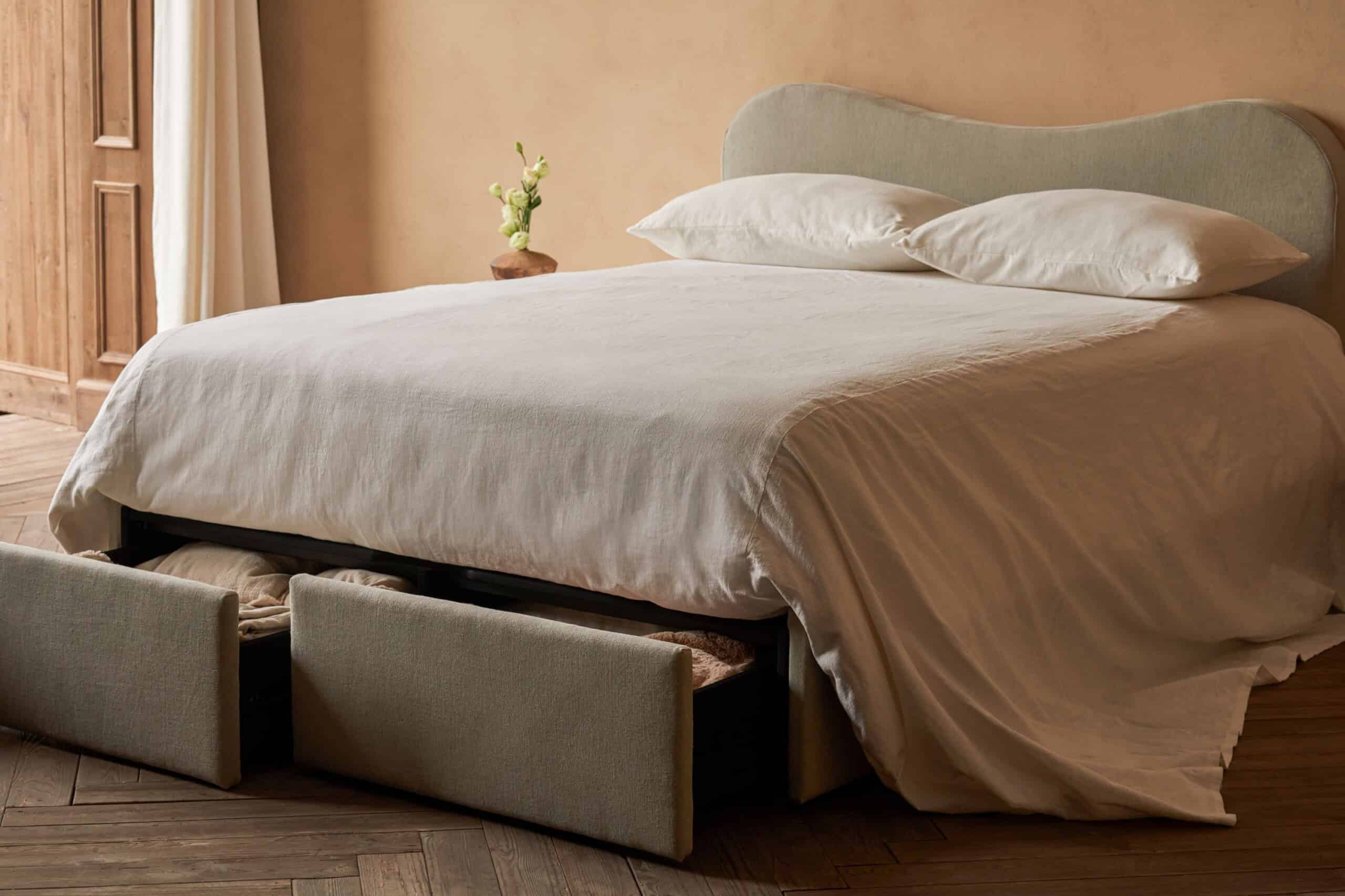 The newest Devyn, Esmé, and Neva storage beds launched earlier this month and are available in queen and king sizes in seven delicious fabric choices: Washed Cotton Velvet, Thread-Dyed Cotton Linen, Recycled Faux Fur, Recycled Poly Linen, Recycled Poly Weave, Medium Weight Linen, and Light Weight Linen. They also come in up to 30 different color options—from classic neutrals to bright sunflower yellow, deep emerald green, and everything in between.