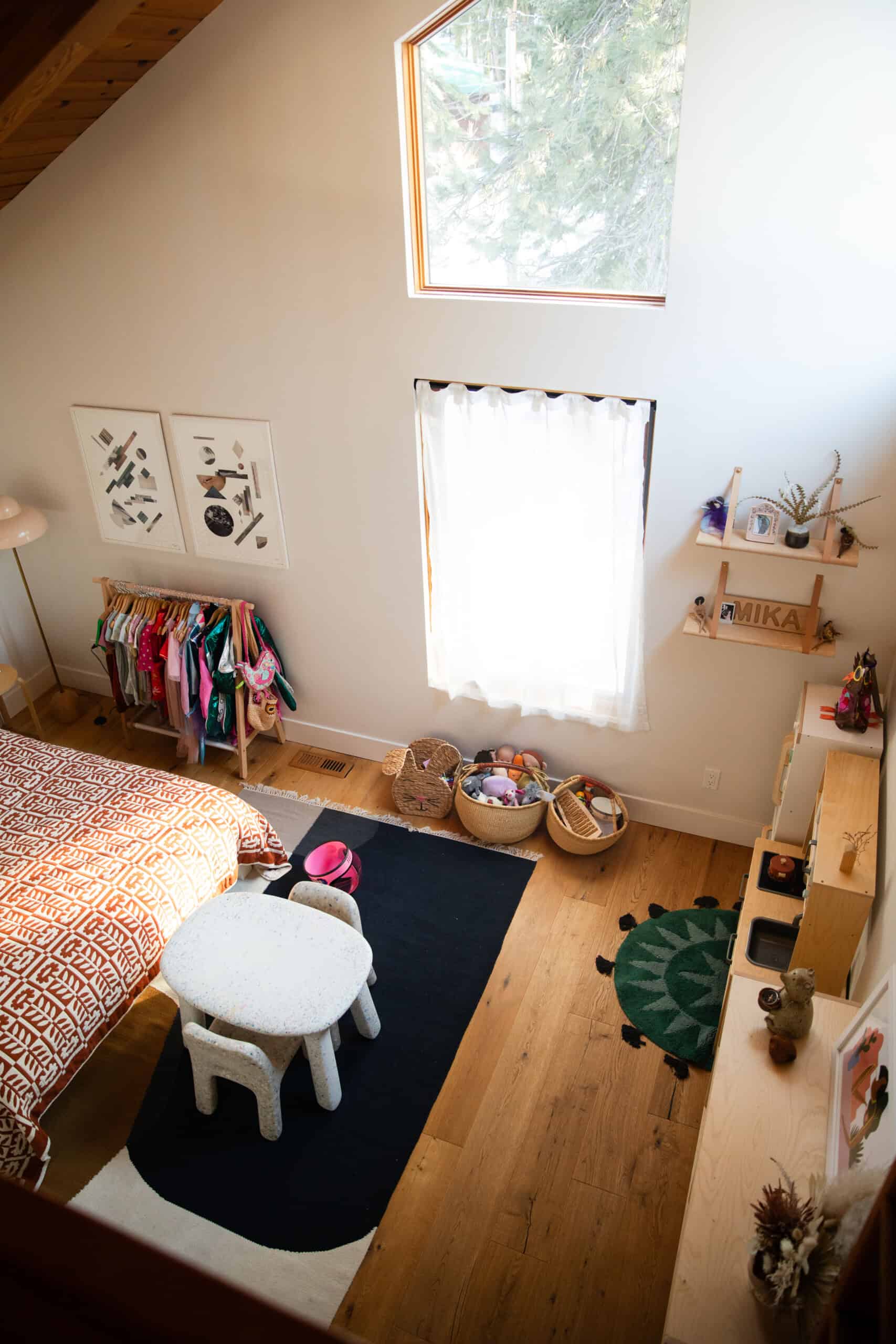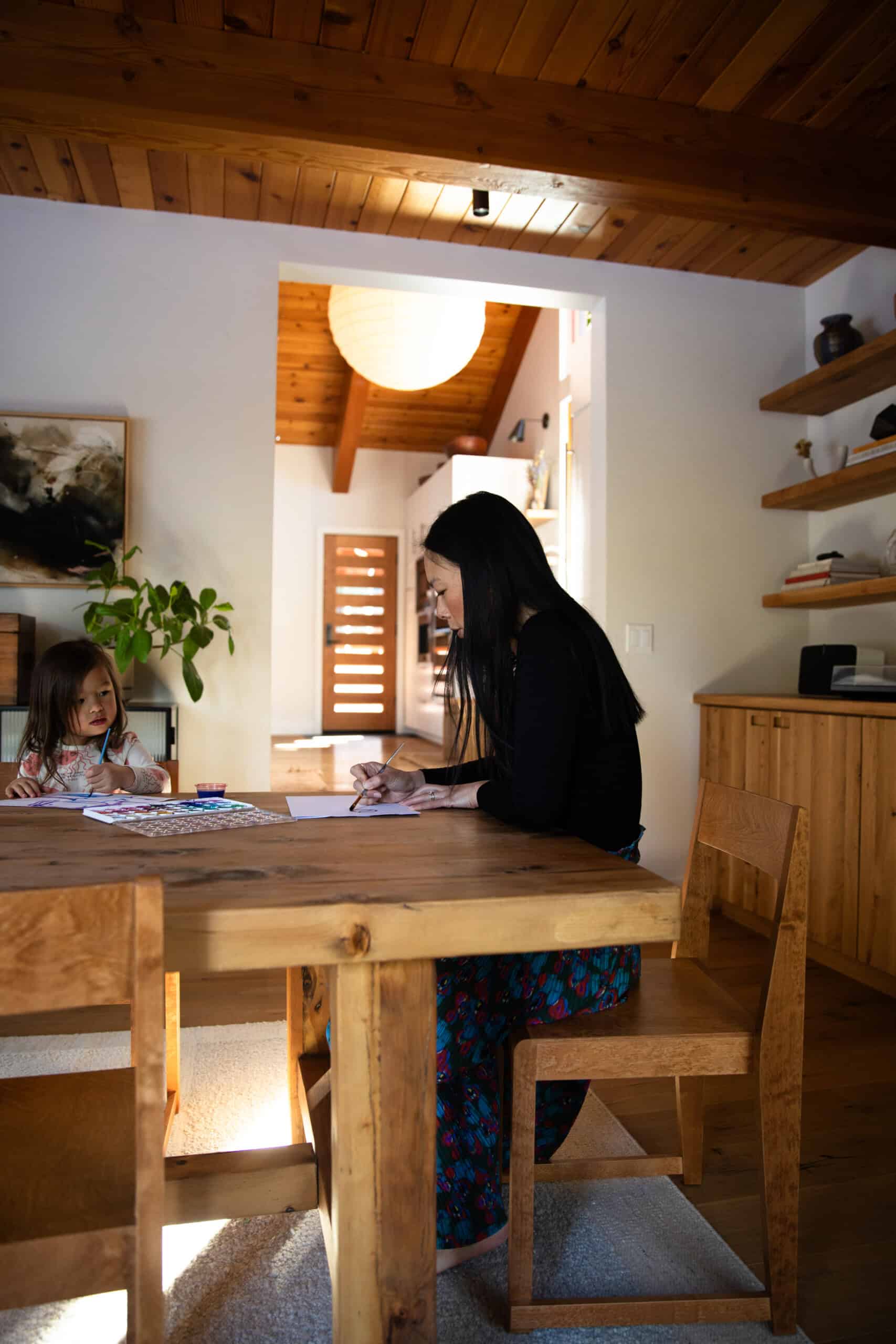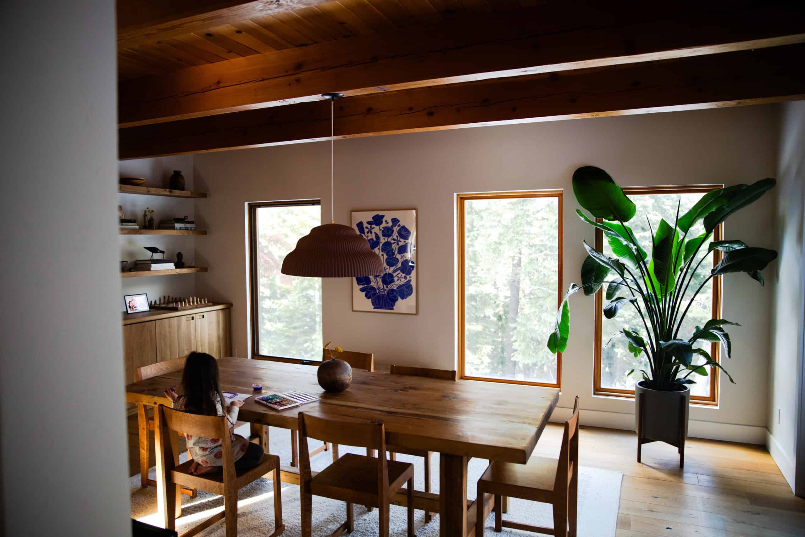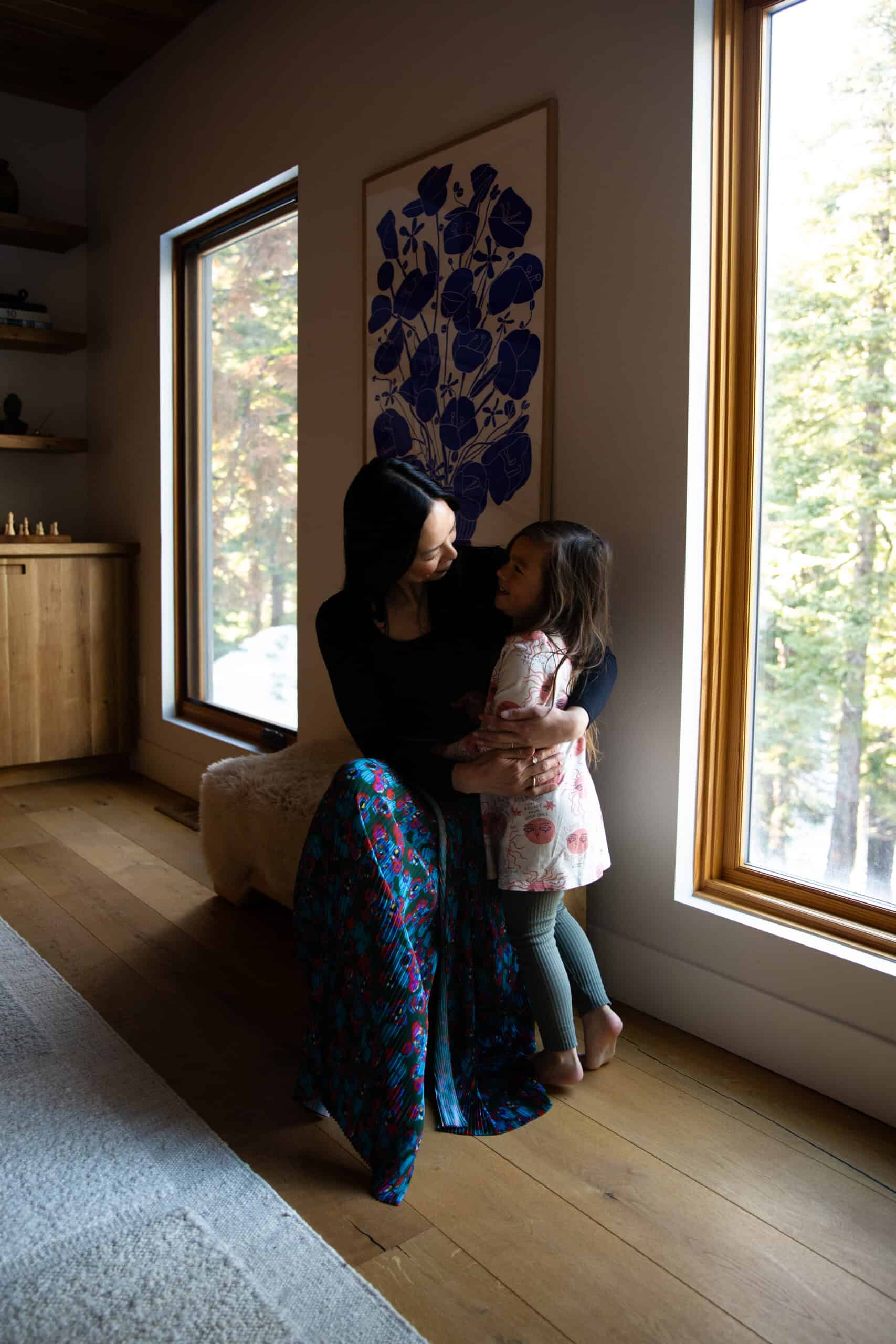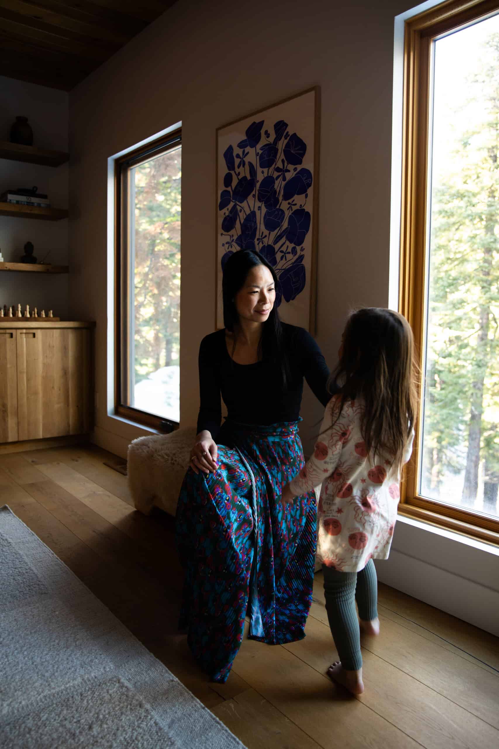 Moving from the bustle of L.A. to the rustic Tahoe area has been an ideal place for this new phase of life. When Mika, almost 5, is not at her Waldorf-style preschool, she counts the surrounding mountains and rivers as her playground. Plus, there’s the family’s absolutely stunning, cabin-like home, which you can get a complete tour of in today’s profile.