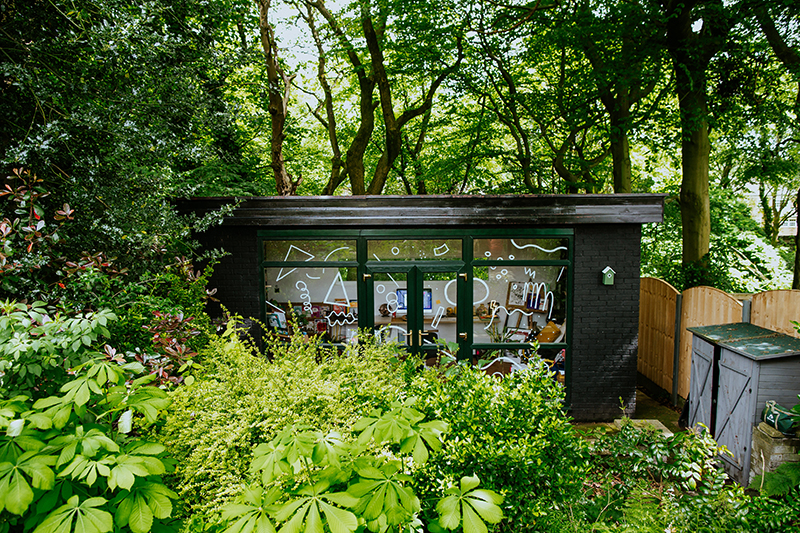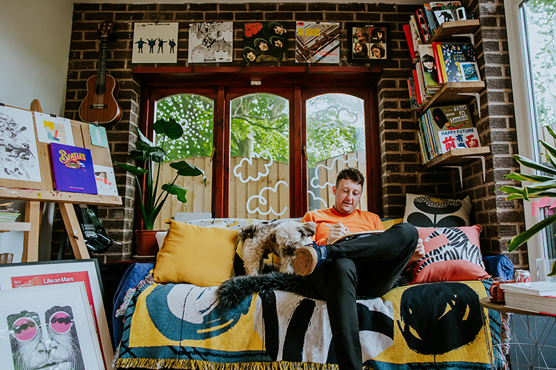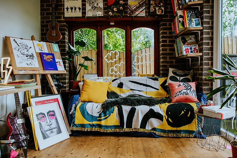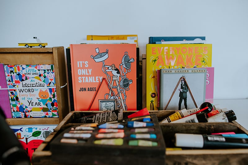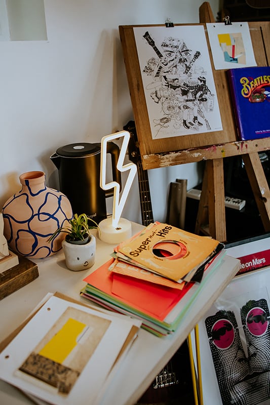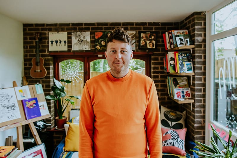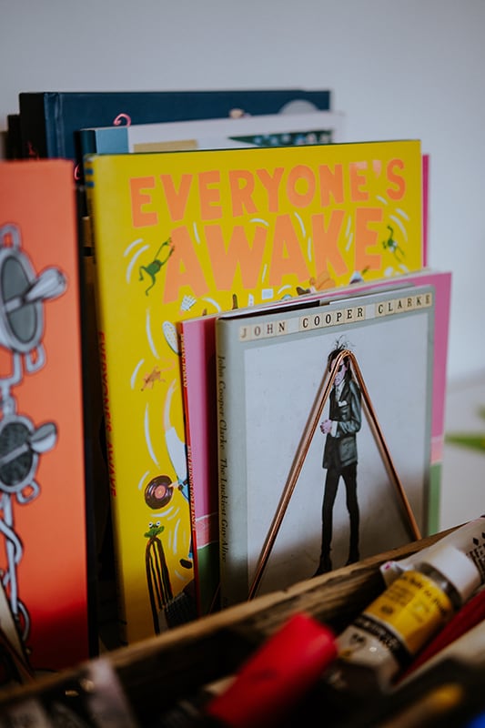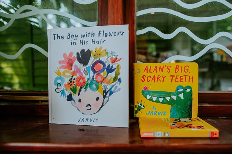 It’s been a while since we’ve visited one of our favorite kid-lit creators in their spaces. But today’s studio visit with Manchester-based author-illustrator Jarvis is certainly worth the wait. Not only are we obsessed with the U.K. creative’s new backyard space—filled to the brim with lushly illustrated kids’ books, Beatles records, and other colorful tools of the trade—we’re equally enamored with his stunning new picture book, The Boy With Flowers In His Hair.