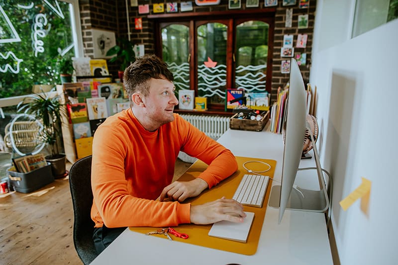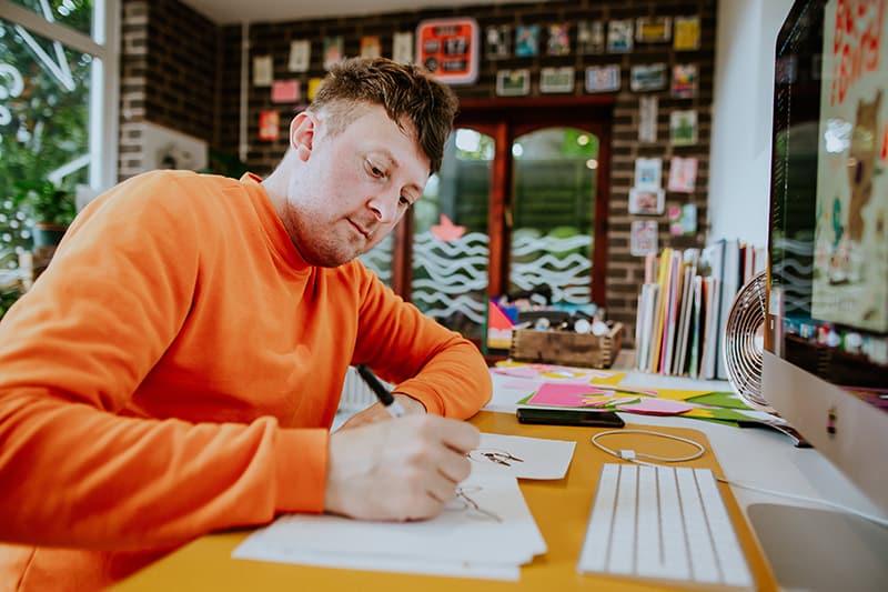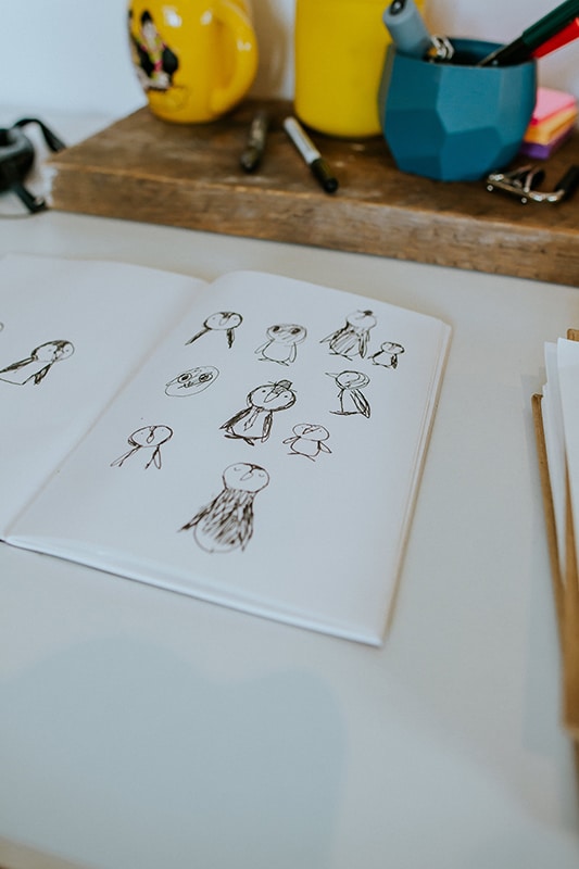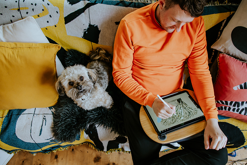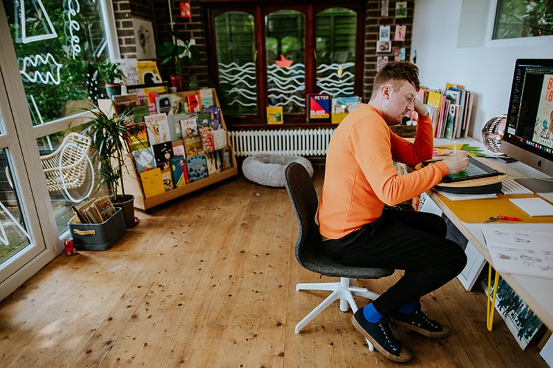 Below, the charming award-winning artist (who’s sold 1+ million books and counting) and proud dog dad gives us a tour of his inspiring workspace, while discussing his big break in the children’s book world, his creative habits and routines, and the brand-new direction he’s exploring in his latest title. Enjoy!